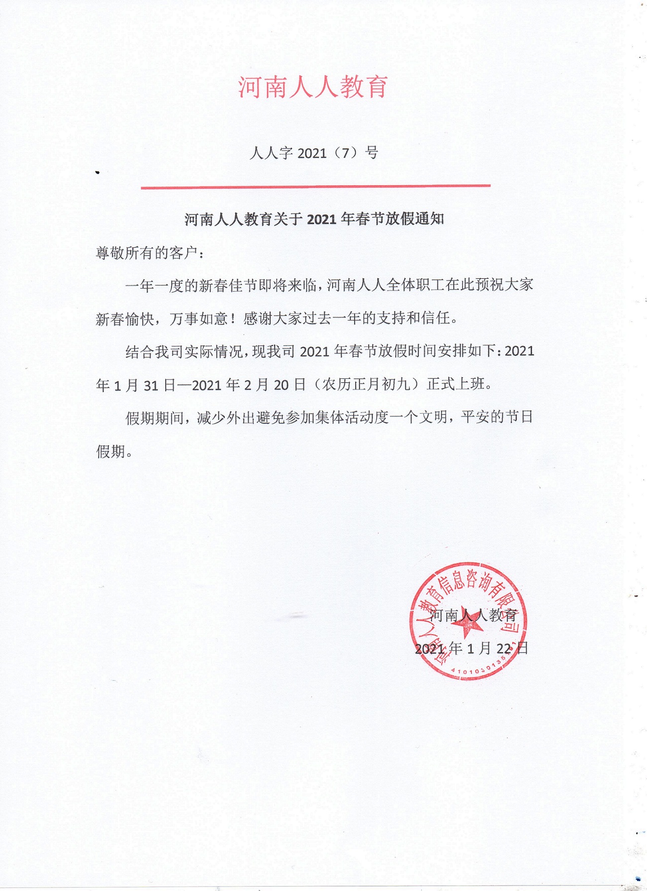 河南人人教育关于2021年春节放假通知